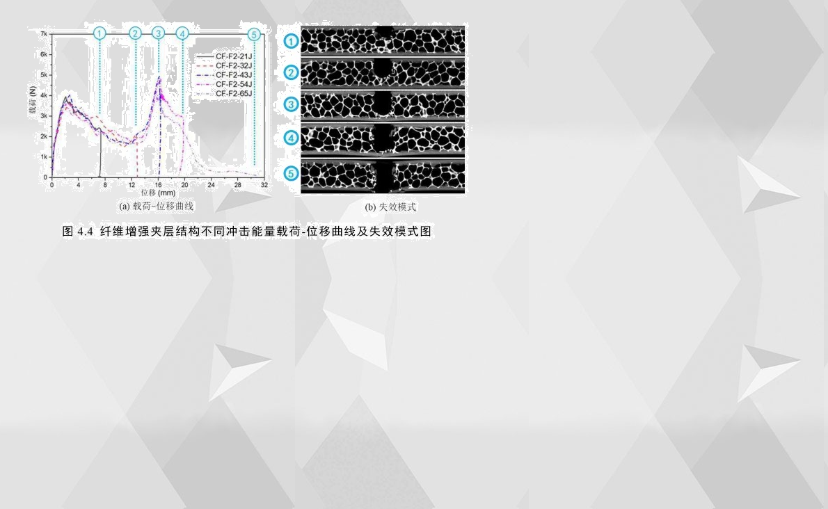通過分析發現,碳纖維夾層結構和玻璃纖維夾層結構的具備相似的沖擊失效機理,以CF-F2為例,通過其在不同沖擊速度下得到的載荷-位移曲線對比來看,如圖4.4(a)所示,當前速度范圍的應變率對此纖維增強夾層結構的機械響應影響不大,所以亦可以用不同沖擊速度下的試件最終破壞形式來分析其損傷失效機理,這與鋁合金夾層結構的分析方法類似。通過觀察發現,CF-F2的載荷-位移曲線和失效過程與AL-F2有很大地相似性,均存在兩個峰值載荷并且未出現面板與膠層失效分離。與AL-F2不同的是,由于CF-F2面板為脆性材料,其載荷達到第一次峰值載荷的位移要比AL-F2的小許多,并且CF-F2在第一階段的曲線更加接近線性增長;此外,前者在兩峰值載荷下降位置處,面板發生塑性斷裂,而后者發生脆性斷裂;由于兩者的第二階段皆以上下面板斷裂為界,所以此階段主要以泡沫芯層壓潰與芯層剪切吸能沖擊能量,通過對比兩者的第二階段,發現此階段兩者的位移長度基本一致。需要特別注意的是,由于CF-F2的下面板的破壞區域位置比上面板的更大,如圖4.4(b)所示,其第二峰值載荷甚至比第一峰值載荷更高。
